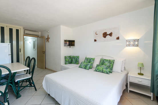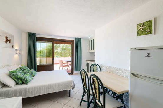 Monolocali 2 posti letto: soggiorno con letto matrimoniale, angolo cottura, bagno con doccia, patio esterno con secondo tavolo